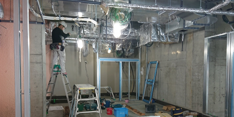 具体的には、間仕切りの壁や、クロスの貼り付け、建具の取り付けから天井や床の貼り付けなどを行っていきます。 また、店舗になるとそこへ水道やガス、電機などの設備工事も入ってきます。 内装工事は、そういった専門分野の工事をすべて行うことができる仕事となっています。